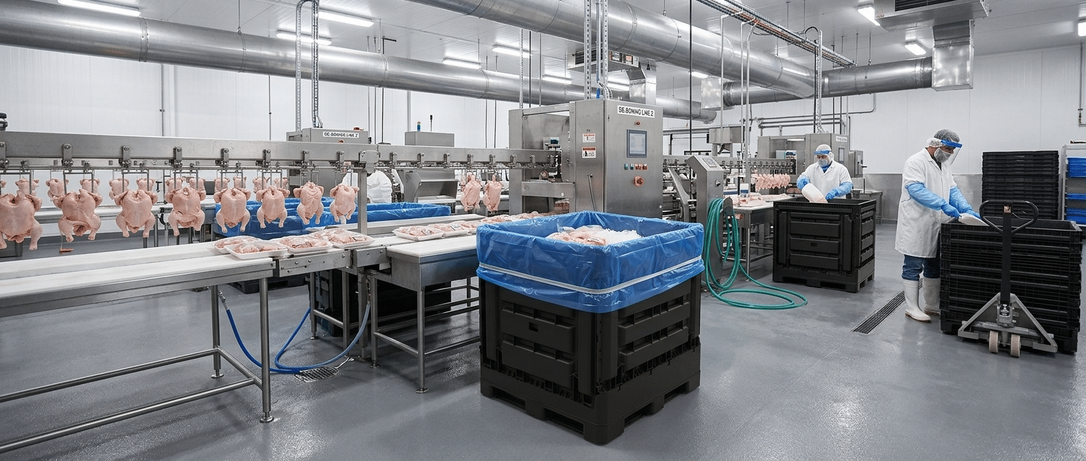 A versatile folding bulk container built for food production efficiency. The 40 × 48 Flex Bin is a reusable plastic bulk container designed for processors needing strength, sanitation, and workflow flexibility.